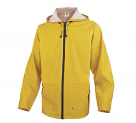 雨衣套装,分为上衣和裤子;接缝处缝合且粘牢密封。上衣带帽子和帽带,带有拉链,内有防风帽边;套袖带有按扣式袖口。袖孔处有通风口。背部垂边可透气。2个带有沿边的口袋;裤子带腰带,裤脚带按扣,2个开口式口袋;涤纶雨衣,PVC涂层;雨